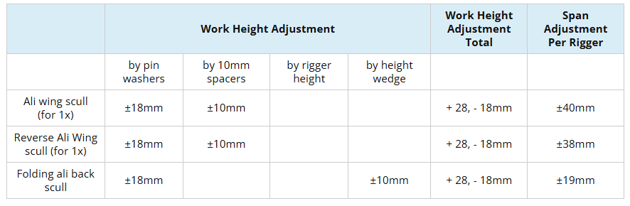 Los riggers traseros Ali Back Scull tienen un ajuste de altura de trabajo adicional de ±10mm con los «espaciadores de 10mm» de Swift, Prod# Rig94 (no suministrado como estándar).