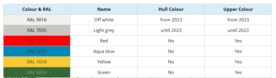 Todos los cascos son de color gris claro, y existen 4 posibilidades para la parte superior del barco (cubiertas y bañera), así: